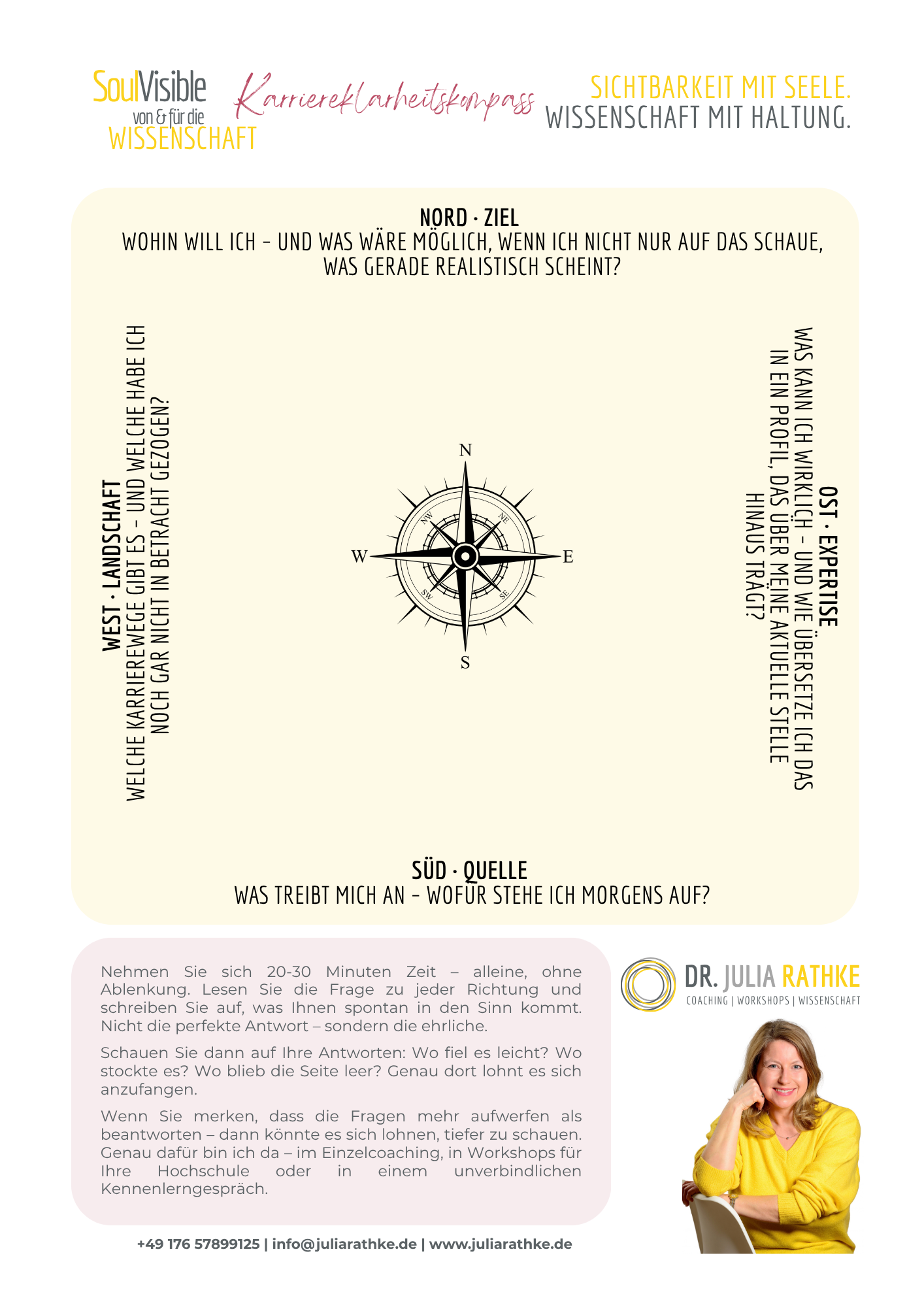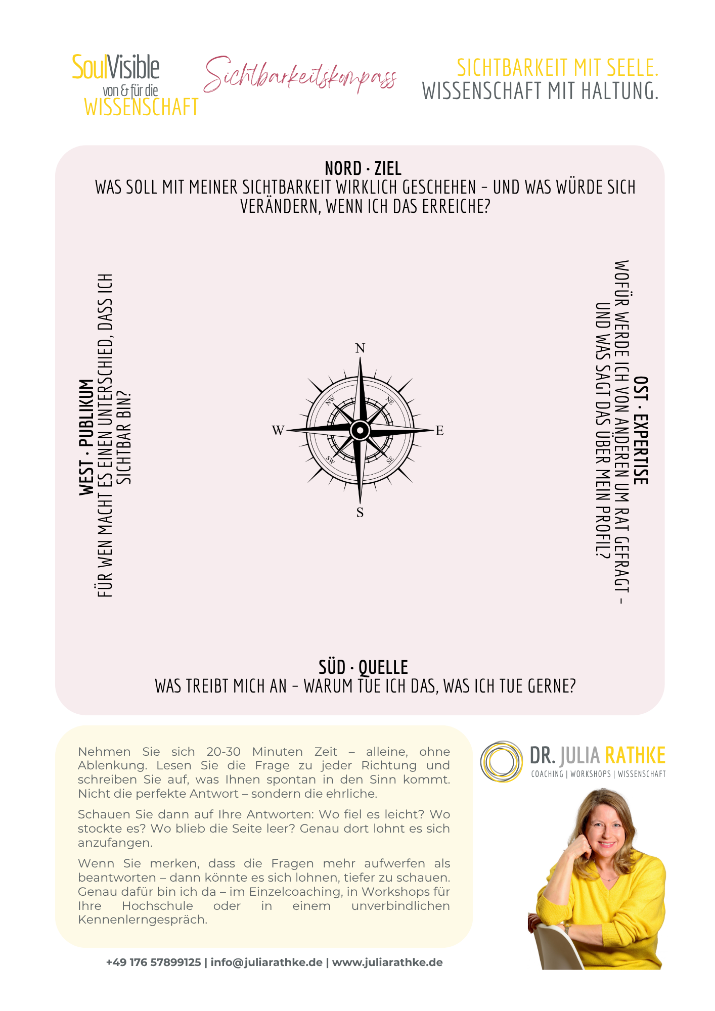 Als Grundlage aller meiner Angebote – ob Coaching oder Workshop, ob Sichtbarkeit oder Karriereklarheit – nutze ich den von mir entwickelten Sichtbarkeitskompass und Karriereklarheitskompass. Beide führen in vier Richtungen und machen sichtbar, wo Klarheit bereits vorhanden ist – und wo noch nicht.